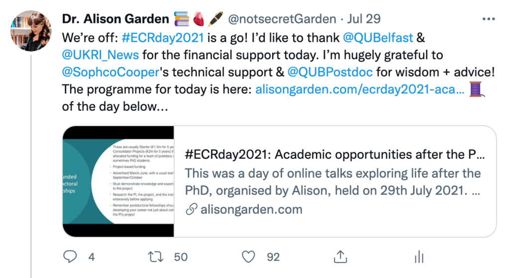 This was a day of online talks exploring life after the PhD, organised by Alison, held on 29th July 2021. These talks were recorded and you can see these below. If you’d like to tweet about about any of these videos, please use the hashtag #ECRday2021 and make sure to cite/tag someone if you are sharing an image of their slides. You can read through Alison’s tweets from the day, which have links to additional resources, here.